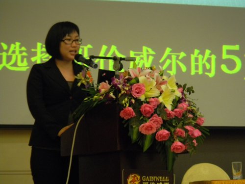 上圖:國(guó)富縱橫美盈項(xiàng)目負(fù)責(zé)人田女士作哥倫威爾品牌推介